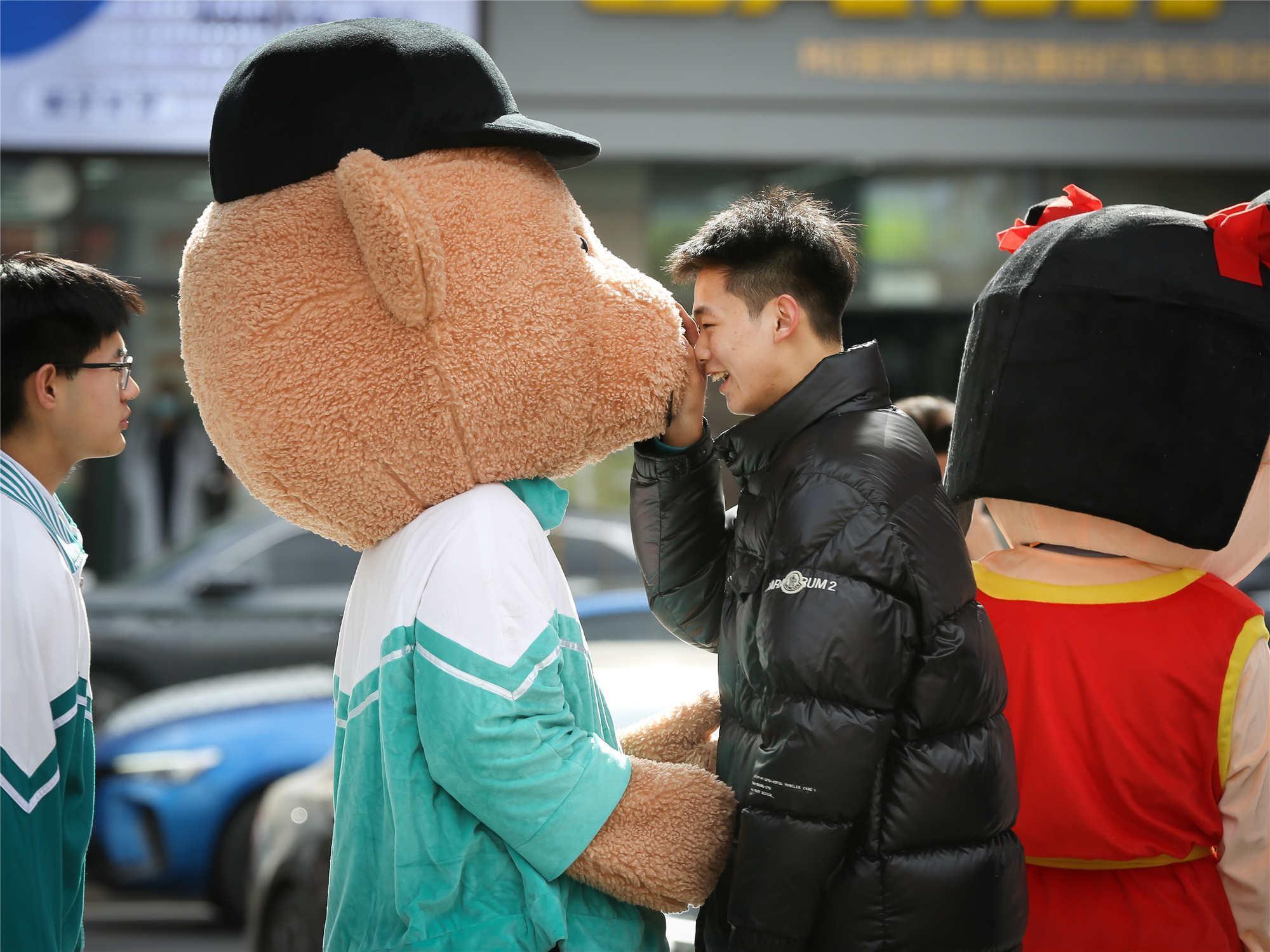 北京昌平一中学生与校服熊玩偶互动。校方供图